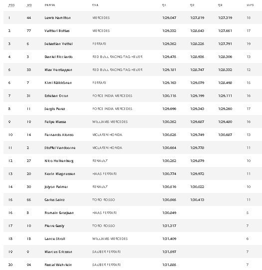 Rekan setim Hamilton, Valtteri Bottas, start dari posisi kedua setelah mencatatkan waktu terbaiknya 1 menit 27,651 detik pada Q3. Pebalap Ferrari Sebastian Vettel menempati posisi start ketiga dengan keberhasilan menorehkan waktu 1 menit 27,791.